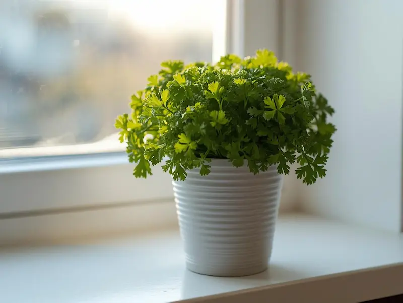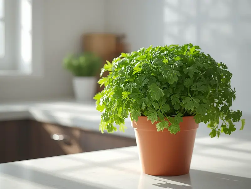 Entretien : Le persil préfère une lumière douce et un arrosage régulier. Sa croissance est lente mais stable.