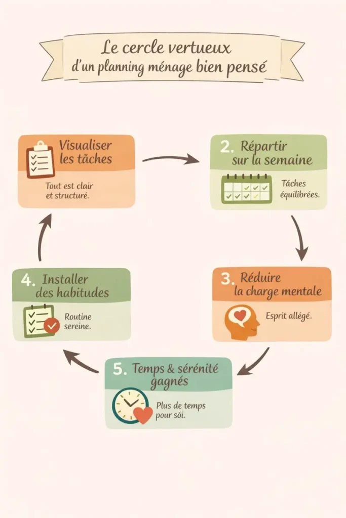 Quand les tâches ménagères sont réparties sur la semaine, elles deviennent plus légères. On n’a plus cette impression d’un énorme bloc insurmontable à gérer le week-end. On gagne en clarté, mais aussi en sérénité. L’organisation domestique devient une routine apaisante, et non plus une source de stress permanent.