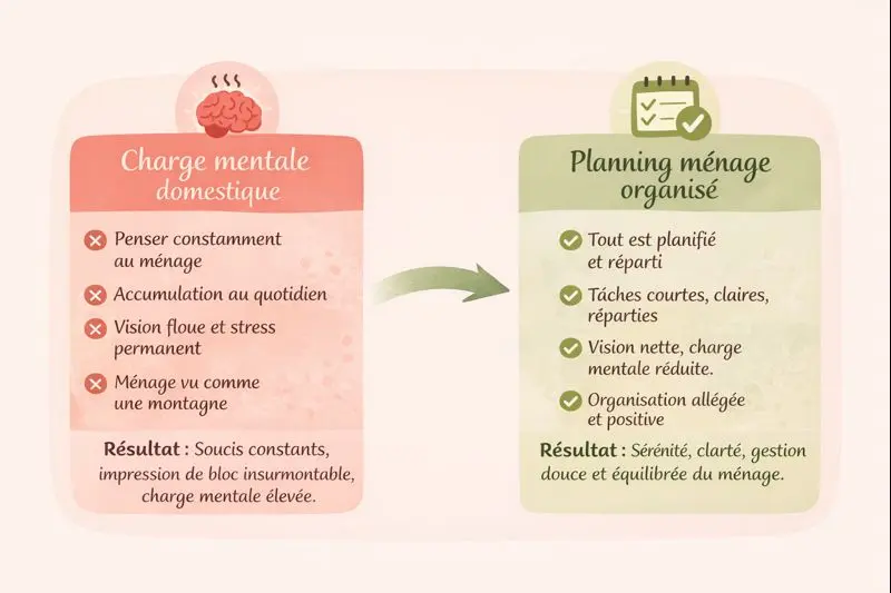 La charge mentale liée au ménage est rarement visible. Ce n’est pas seulement nettoyer, c’est penser à nettoyer. Penser à ce qui n’a pas été fait, à ce qui devra être fait demain, à ce qui traîne depuis trop longtemps. Le planning ménage agit comme un déchargeur mental : tout est écrit, prévu, posé noir sur blanc.