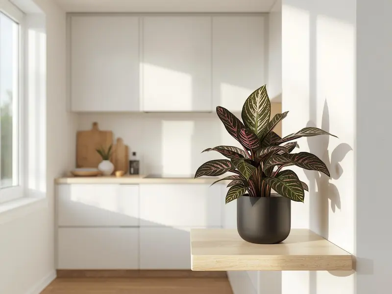 Le calathea est parfait si tu veux une plante au feuillage décoratif très marqué. Il aime l’humidité ambiante, fréquente en cuisine, et crée une atmosphère douce et élégante, idéale pour une décoration intérieure apaisante.