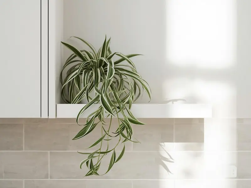 Le chlorophytum est idéal pour une cuisine active. Il résiste à la chaleur, tolère les oublis d’arrosage et apprécie l’air légèrement humide. Son feuillage graphique apporte une sensation de fraîcheur et aide aussi à limiter certaines odeurs de cuisine.