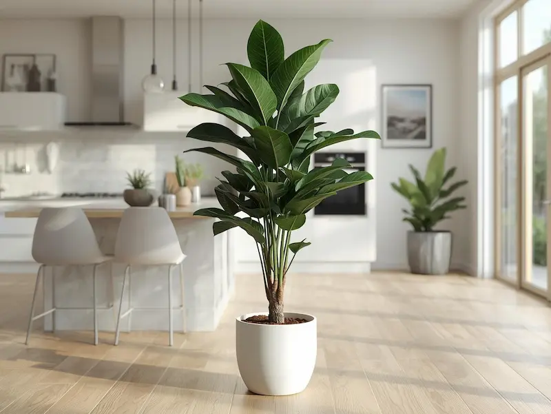 Le ficus elastica fonctionne très bien dans une cuisine lumineuse. Il supporte la chaleur et apporte une vraie présence végétale. Son feuillage épais donne du caractère à la pièce tout en restant facile à vivre.