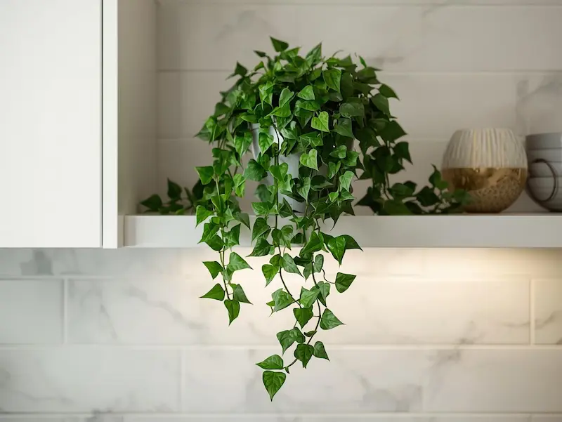 Le lierre est une plante décorative polyvalente. En cuisine, il se plaît en hauteur, sur une étagère ou en suspension. Il tolère bien l’humidité et la chaleur modérée, et apporte une touche naturelle sans envahir l’espace.