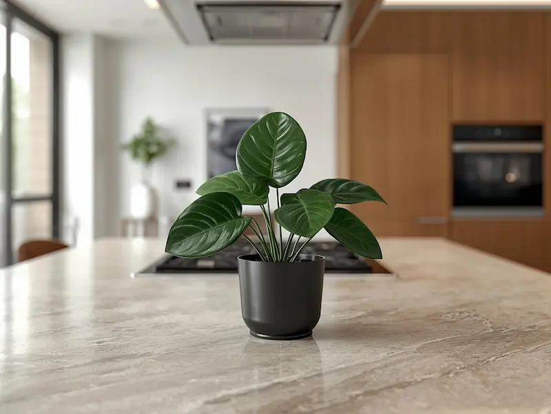 Si tu cherches une plante d’intérieur résistante, le zamioculcas est un excellent choix. Il supporte la chaleur, la faible lumière et les arrosages espacés. Son feuillage brillant et structuré donne un style moderne et minimaliste à la cuisine.