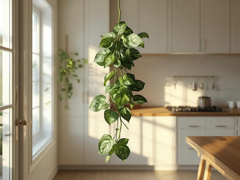 Le pothos est l’une des plantes les plus simples à vivre en cuisine. Il supporte très bien l’humidité et s’adapte aussi bien à une cuisine lumineuse qu’à une pièce plus sombre. Son feuillage décoratif retombant apporte immédiatement une touche chaleureuse, surtout en suspension ou sur une étagère.