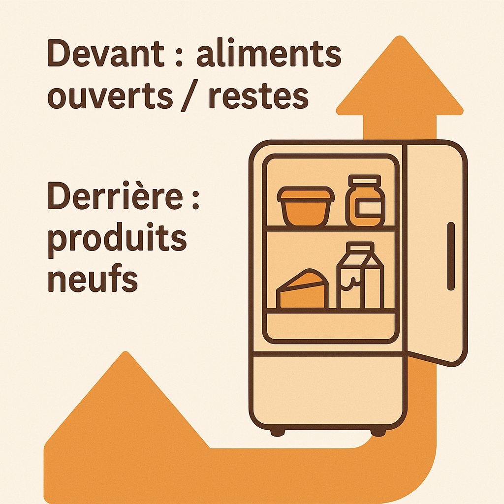 Le problème numéro 1, ce sont les aliments oubliés derrière. Ma méthode : tout ce qui est ouvert, entamé ou proche de la date va devant. Tout ce qui vient d’être acheté va derrière. C’est simple, rapide, et ça réduit énormément le gaspillage.