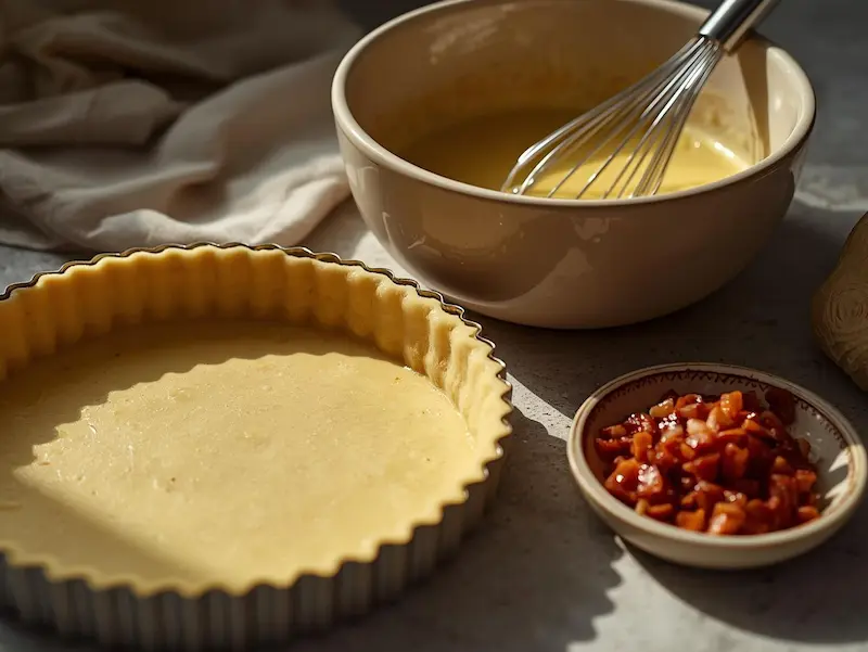 Je commence par précuire la pâte dans le moule à tarte, un geste que j’ai appris très tôt et qui évite une quiche liquide. L’appareil à quiche se prépare tranquillement dans un saladier, sans précipitation, un peu comme lorsque je planifiais les repas de la semaine à l’avance, à la manière d’un batch cooking familial.