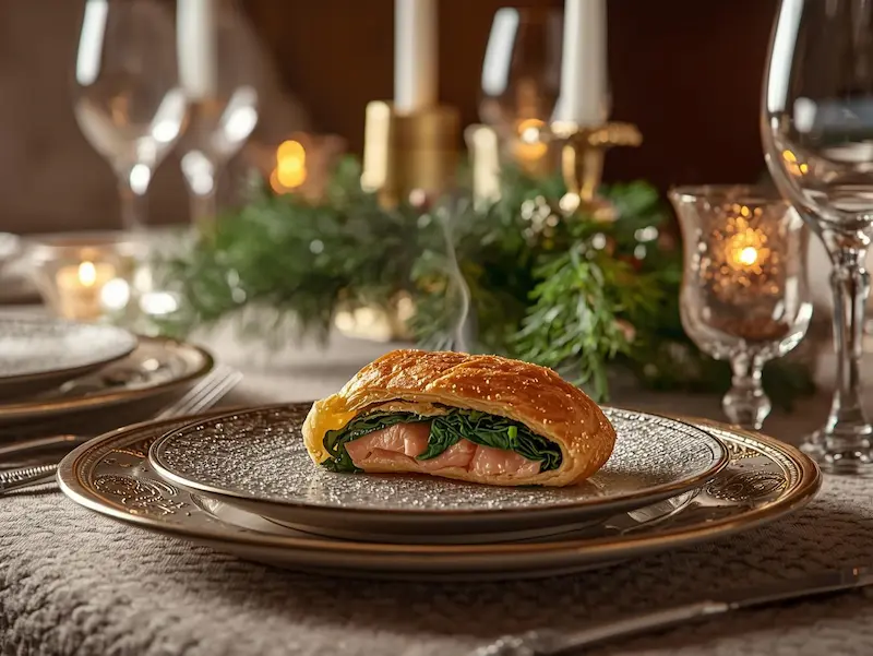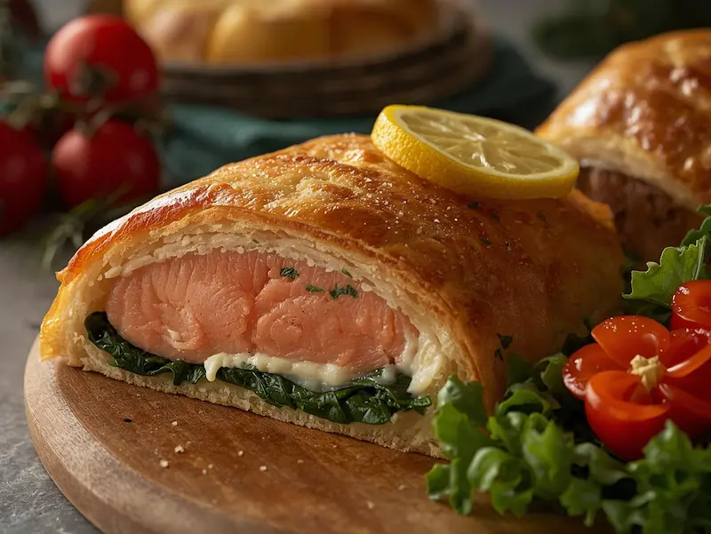 Ce plat de fêtes au saumon se marie très bien avec des légumes rôtis au four, une purée légère ou une salade fraîche et croquante. Ces accompagnements simples permettent de mettre en valeur la chair fondante du saumon et le croustillant de la pâte feuilletée, sans masquer ses saveurs délicates.