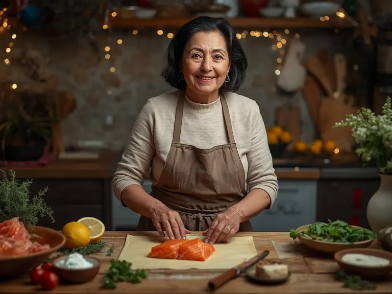 Le petit secret que l’on m’a transmis, c’est de servir le saumon avec un filet de jus de citron ou une sauce très légère à base de fromage frais et d’herbes, proposée à part. Cela permet à chacun d’ajuster selon son goût, tout en respectant l’équilibre et l’élégance de ce plat festif.