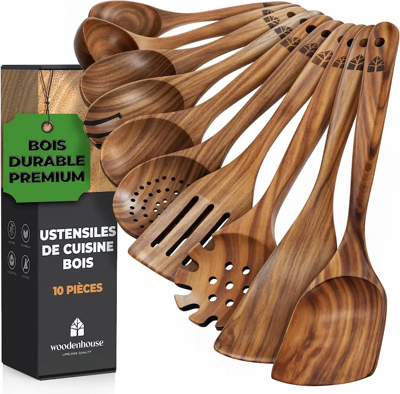 Le bois est le meilleur allié des poêles fragiles et des cuisines qui durent. Choisis un set cohérent avec ton usage (premium en teck si tu cuisines fort, set abordable pour débuter), huile une fois par mois, et ne laisse jamais tremper. Un ustensile qui survit à un vrai service du soir mérite sa place dans ton pot.
